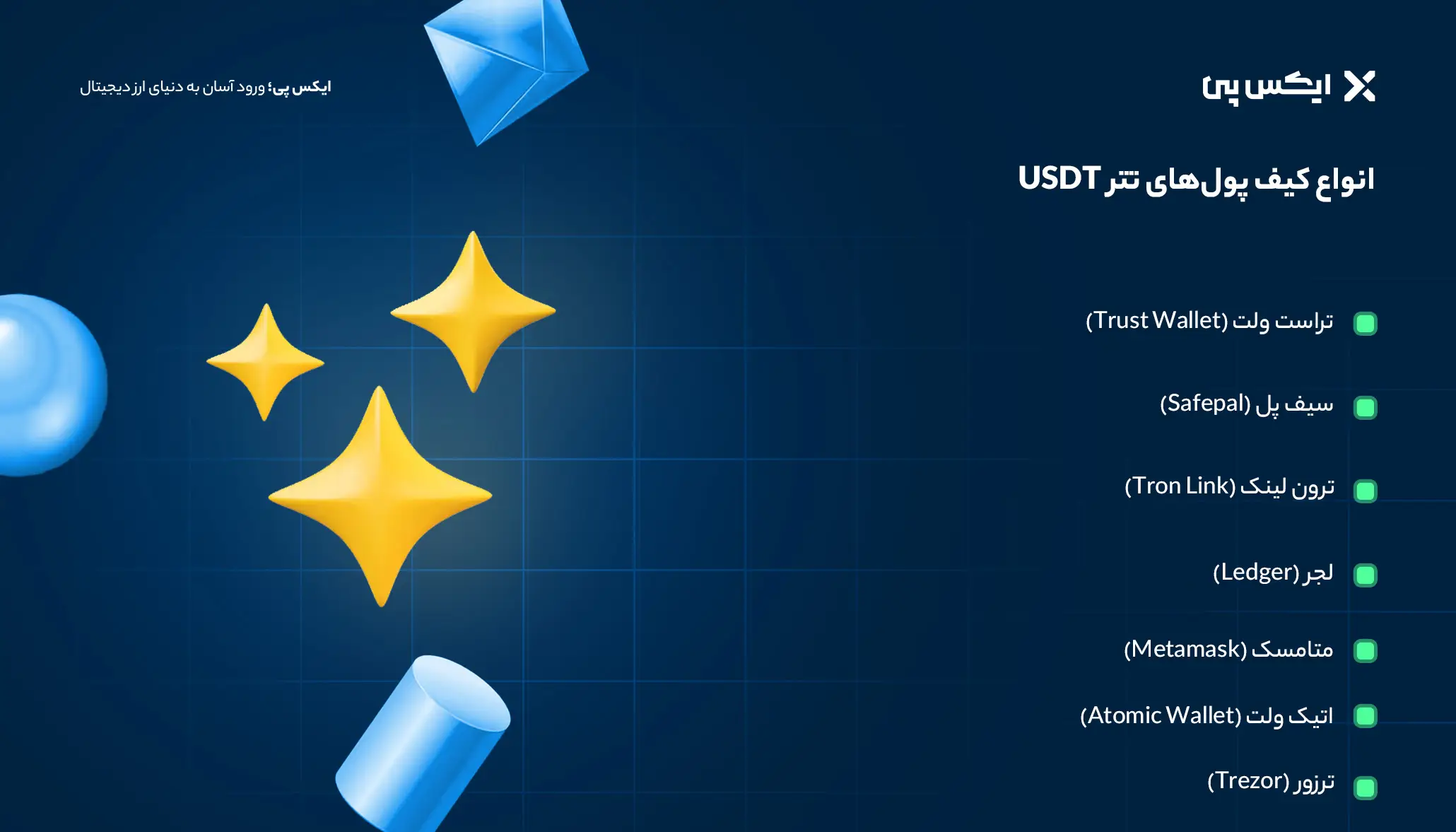 - ایکس پی: صرافی Xpay، امنترین کیف پول برای نگهداری تتر در ایران و انتقال سریع آن را ارائه میدهد.
