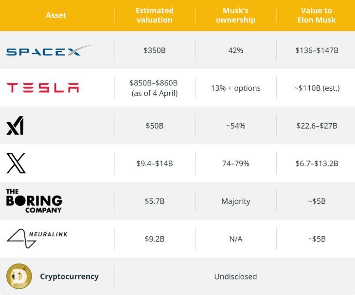 سهام تسلا همچنان بخش قابلتوجهی از ثروت گسترده ماسک را تشکیل میدهد. در اینجا شرح مختصری از داراییهای ماسک تا تاریخ ۳۱ مارس ۲۰۲۵ را آوردهایم:
