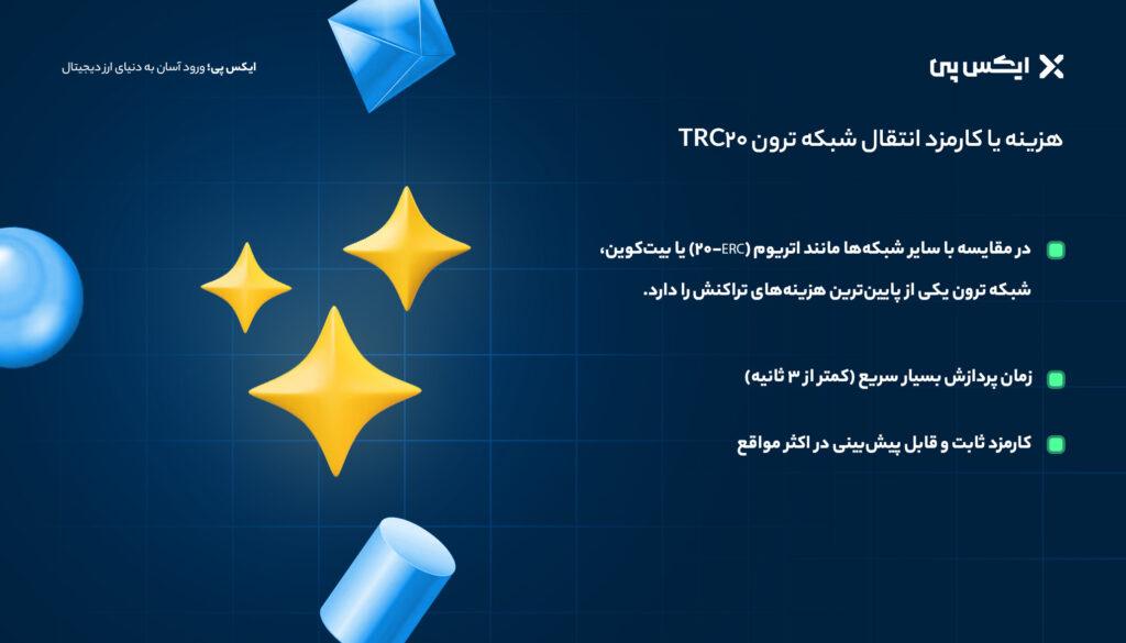 در مقایسه با سایر شبکهها مانند اتریوم (ERC-20) یا بیتکوین، شبکه ترون یکی از پایینترین هزینههای تراکنش را دارد. این بلاکچین که توسط جاستین سان (Justin Sun) ساخته شده است، کارمزد رقابتی با سایر شبکهها دارد. میانگین کارمزد انتقال ارز دیجیتال ترون در شبکه Tron (و دیگر توکنهای این شبکه) معمولا کمتر از 0.01 دلار است و در برخی مواقع حتی رایگان نیز محاسبه میشود.