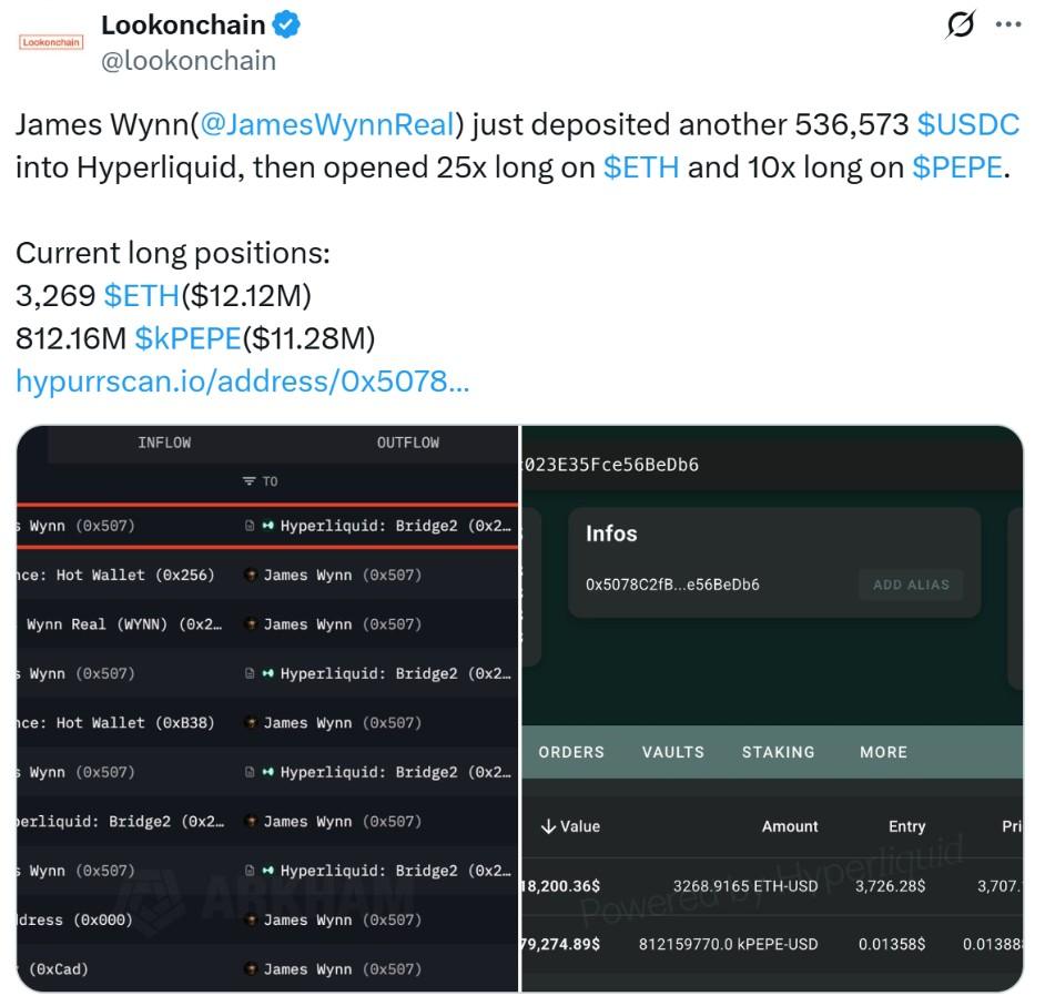 به گزارش ایکس پی و به نقل از کوین تلگراف، جیمز وین (James Wynn)، تریدر پرریسک بازار ارز دیجیتال، روز یکشنبه دو معامله اهرمی سنگین باز کرده است. او یک پوزیشن لانگ ۲۵ برابری روی اتریوم (ETH) و یک پوزیشن لانگ ۱۰ برابری روی پپه (PEPE) گرفته است. مجموع ارزش این معاملات بیش از ۲۳ میلیون دلار است.