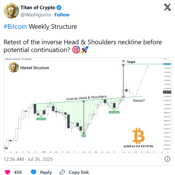 همچنین یک تحلیلگر ارز دیجیتال دیگر با نام Titan of Crypto احتمال داده که قیمت بیت کوین ممکن است تا سطح ۱۱۲٬۰۰۰ دلار کاهش پیدا کند و خط گردن الگوی سر و شانه معکوس را آزمایش کند.