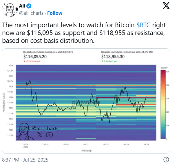 تحلیلگر ارز دیجیتال علی مارتینز (Ali Martinez) در یک پست در شبکه اجتماعی X، اعلام کرد که دو سطح کلیدی برای قیمت بیت کوین در حال حاضر، ۱۱۶٬۰۹۵ دلار بهعنوان حمایت و ۱۱۸٬۹۵۵ دلار بهعنوان مقاومت هستند. به گفته او، این سطوح بر اساس توزیع میانگین قیمت خرید سرمایهگذاران تعیین شدهاند.